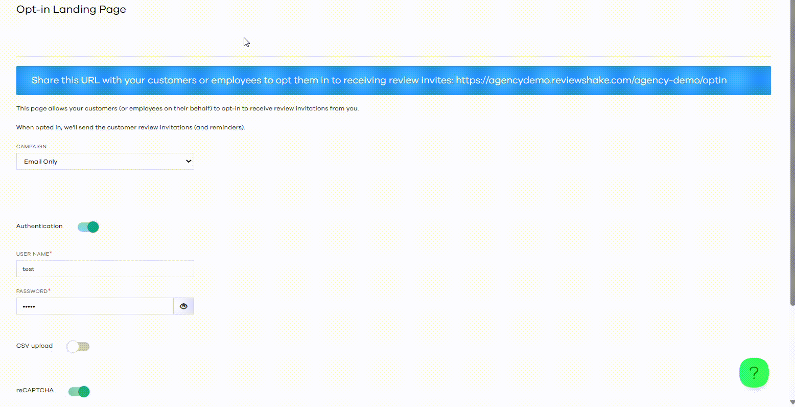 To set up your opt-in page, you must have a campaign - your customer will get added to the Campaign once they are opted in. This allows you to set a delay on the review invitation, reminders, and more options.
