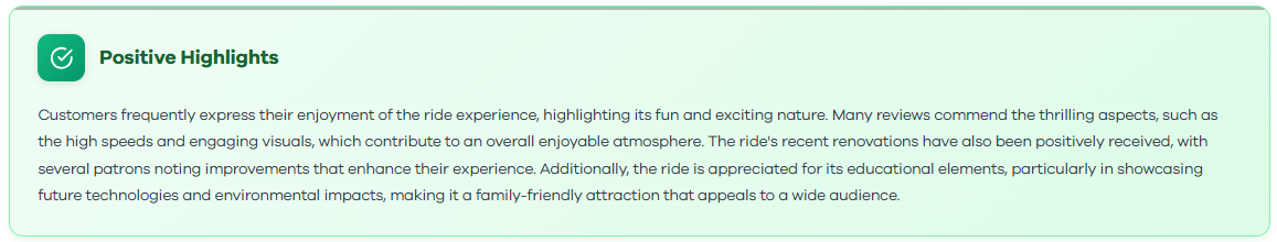 Positive Highlights: Shows what customers consistently like and appreciate. Examples include enjoyable experiences, standout features, recent improvements, or elements customers find exciting and engaging.