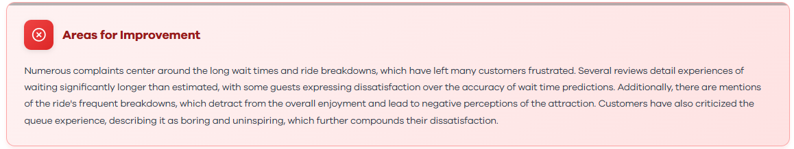 Areas for Improvement: Focuses on recurring complaints or pain points that may require action. Common themes might include delays, service interruptions, inaccurate expectations, or areas that feel underwhelming to customers.