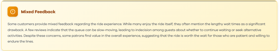 Mixed Feedback: Provides a balanced view of reviews that mention both positives and negatives. This often includes comments where customers enjoy the experience but note drawbacks such as wait times or minor issues.