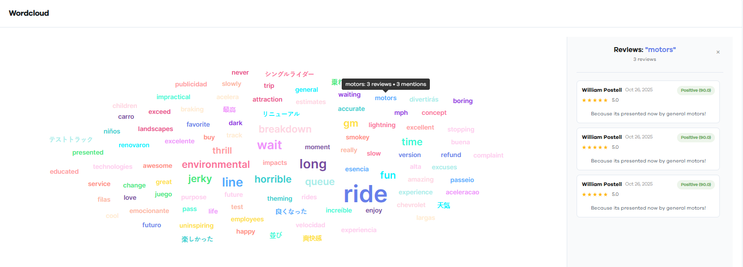 Keyword & Topic Insights: Word clouds highlight frequently mentioned terms, helping uncover common praise or pain points.
